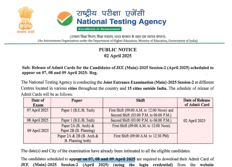 JEE Mains 2025 Session 2 Admit Card Release for April 7, 8 & 9 examsApril 2, 2025