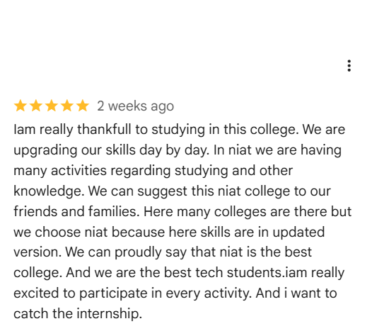 NIAT Guntur reviews offer a genuine insight into campus life, learning experiences, and career opportunities available at the institute. These reviews highlight what actual students and their parents think about the program, including its focus on practical skills, modern infrastructure, supportive mentors, and a strong placement network. Reading these real experiences helps future students understand how NIAT Guntur prepares learners for technology careers and what makes it stand out from regular engineering colleges.