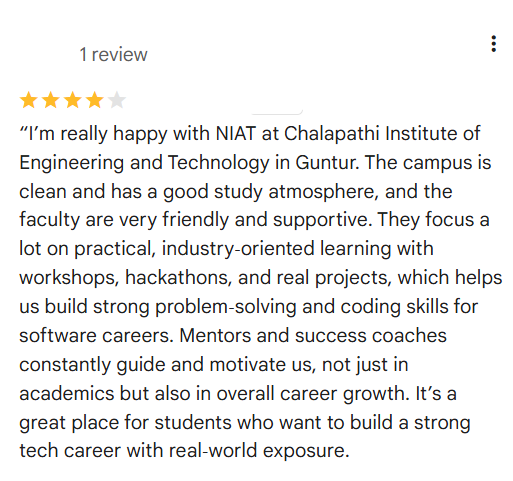 NIAT Guntur emerges as a promising destination for students seeking industry-relevant technical education with strong practical exposure. The overwhelmingly positive NIAT Guntur reviews across infrastructure, faculty quality, and placement support indicate a well-structured educational ecosystem that prioritises skill development over traditional theoretical learning. The collaboration with Chalapathi Institute of Technology and Chalapathi Institute of Engineering and Technology ensures academic credibility, while NIAT’s industry partnerships provide practical career opportunities.