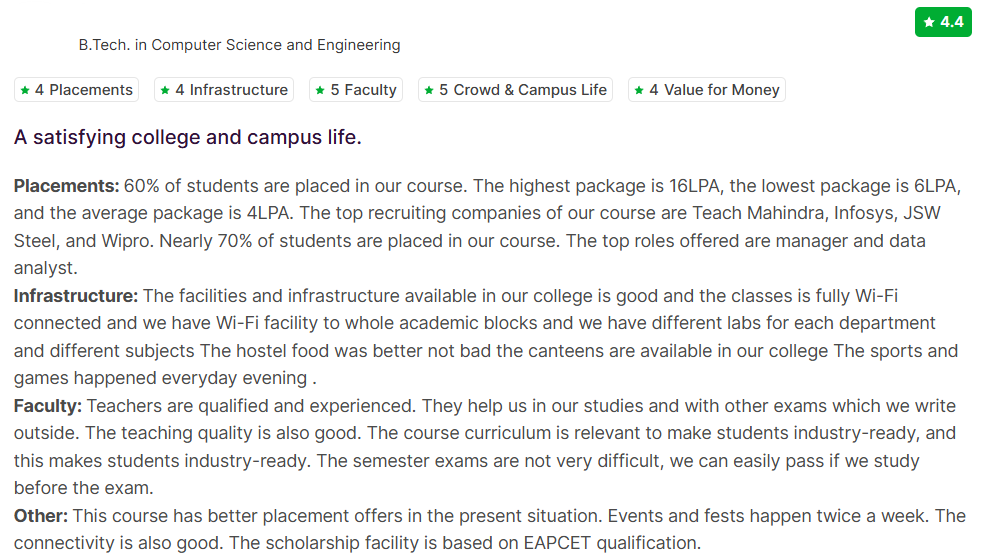 Students reviewing Chalapathi Institute of Technology often mention that the college offers decent infrastructure and supportive faculty members. The campus has spacious classrooms, laboratories, a library, and hostel facilities, which students find satisfactory for academic learning. Placement opportunities are considered average, with many students getting placed in IT service companies like Tata Consultancy Services, Wipro, and Cognizant. Overall, students appreciate the faculty support but feel placement opportunities could improve.