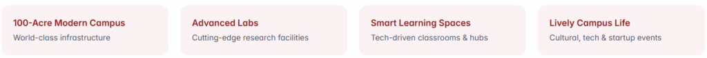 - Students spend all four years on campus, with facilities meeting UGC and AICTE standards.