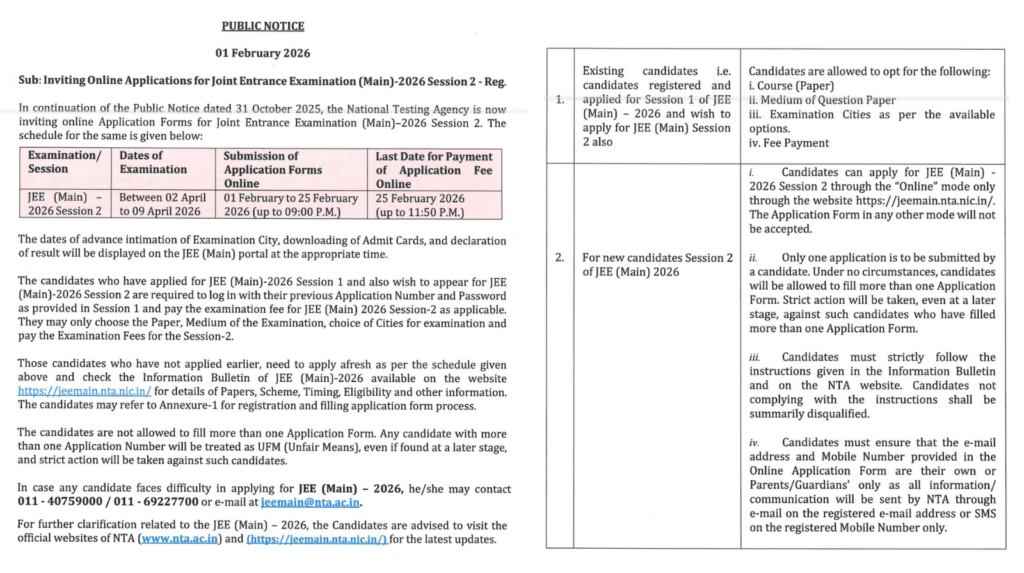 The NTA has released the NTA JEE Mains session 2 registration form, and students can now register for the same through the official portal of the JEE Main 2026. The JEE Mains session 2 registration last date is 25th February, 2026, and candidates must apply by the deadline to participate in the exam. The JEE Mains session 2 exam date is between 02 April and 09 April 2026.