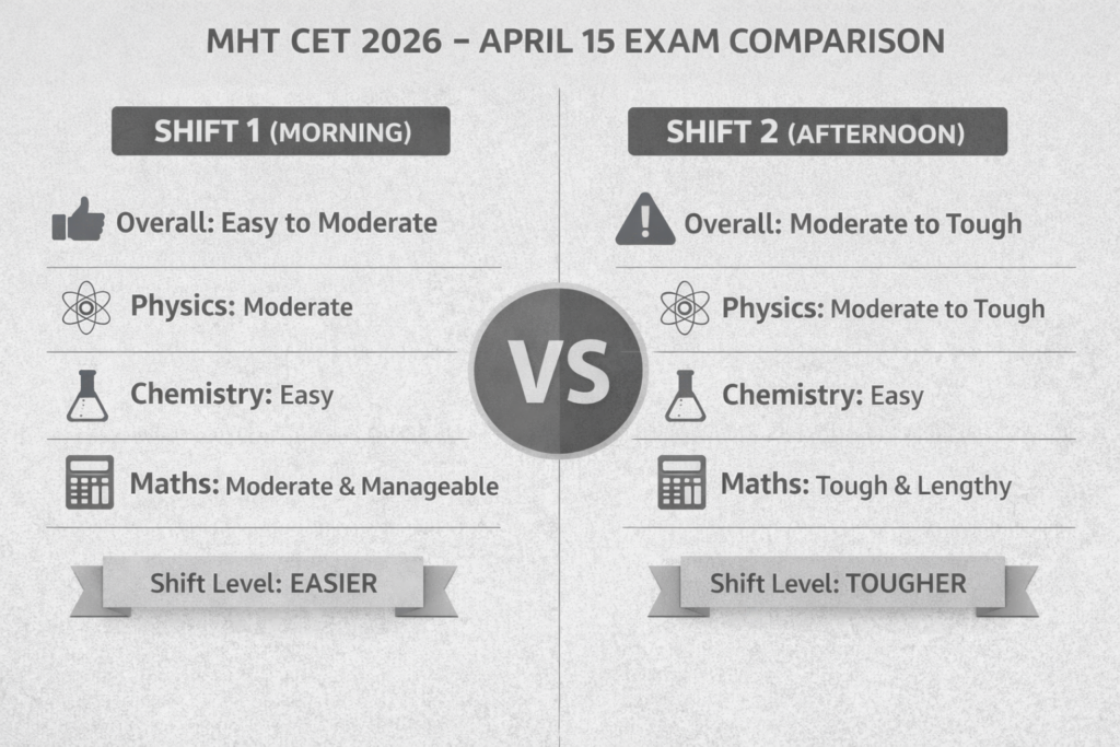 According to the MHT CET Paper Analysis for April 15, Shift 1 was largely simpler (easy to moderate), with tolerable Math and Chemistry scores. Shift 2 was moderate to difficult, owing to long Maths and slightly more difficult Physics.